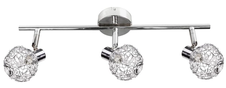 oryginalny klosik druciany w kształcie kuli, zdobiony drobnymi koralikami z akrylu, zamknięty dużym transparentym kryształem w chromowanej oprawce; możliwość regulacji kąta nachylenia klosza w pionie i poziomie; do kompletu: kinkiet, listwa 2 i 4 oraz plafon 3