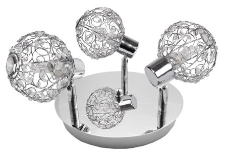 oryginalny klosik druciany w kształcie kuli, zdobiony drobnymi koralikami z akrylu, zamknięty dużym transparentym kryształem w chromowanej oprawce; możliwość regulacji kąta nachylenia klosza w pionie i poziomie; do kompletu: kinkiet, listwa 2, 3 i 4