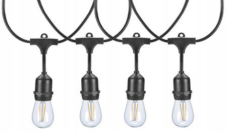 - W komplecie kabel zasilający o długości 15 metrów z gniazdami oraz komplet żarówek Led 15 szt. wszystko zapakowane w specjalne pudełko