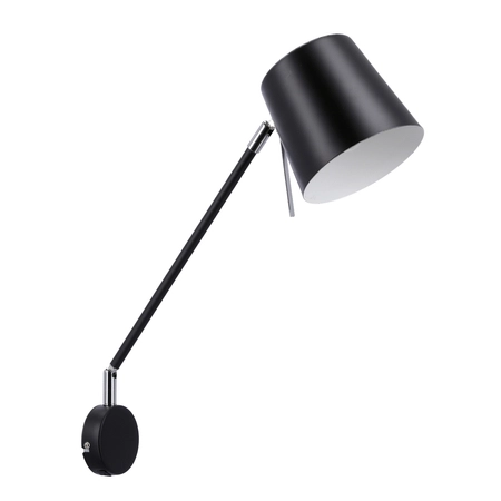 Nowoczesny kinkiet. Wykonany z klosza metalowego na obrotowym ramieniu w kolorze czarnym na podstawie metalowej. W przyściance zamontowany wyłącznik. Nasz kinkiet to wyrazisty akcent w Twoim domu!