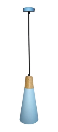 Rodzina lamp wiszących inspirowanych stylem skandynawaskim, wykonanych z kolorowego metalu z drewnianym elementem dekoracyjnym. Lampy występują w trzech kształtach i w trzech kolorach: niebieskim, różowym i zielonym. Doskonale nadają się do pomieszczeń takich jak: salon, jadalnia, kuchnia, sypialnia, gabinet, pokój dziecięcy, pokój młodzieżowy. Ciekawa stylistyka rodziny sprawia, że będą doskonale pasowały również do nowoczesnych wnętrz użyteczności publicznej, takich jak: kawiarnie, puby, salony piękności, itp.Lampa wisząca w kolorze niebieskim z jednym punktem świetlnym. Żarówka nie jest dołączona do produktów z zewnętrznym źródłem światła.