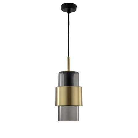 Materiał i kolorystyka: Klosz lampy został wykonany z dymnego szkła z metalową obręczą w kolorze złota.