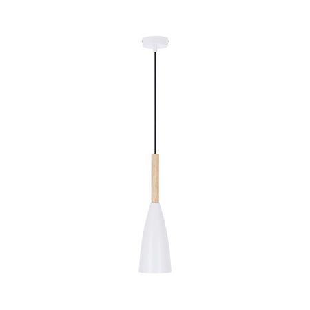 Rodzina trzech lamp wiszących inspirowanych stylem skandynawaskim, wykonanych z kolorowego metalu, z drewnianym elementem dekoracyjnym. Lampy występują w trzech kolorach: czarnym, szarym i białym. Produkty z rodziny doskonale nadają się do pomieszczeń takich jak: salon, jadalnia, kuchnia, sypialnia, gabinet, pokój młodzieżowy, pokój dziecięcy. Ciekawa stylistyka rodziny sprawia, że będą doskonale pasowały również do nowoczesnych wnętrz użyteczności publicznej, takich jak: kawiarnie, puby, salony piękności, itp. Lampa wisząca w kolorze białym z jednym punktem świetlnym. Żarówka nie jest dołączona do produktów z zewnętrznym źródłem światła.