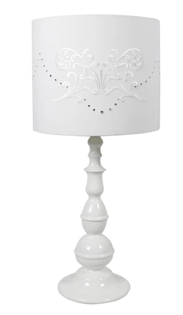 biała kolorystyka abażuru w połączeniu z ozdobną metalową podstawą; zestaw do doświetlania stonowanych klasycznych pomieszczeń