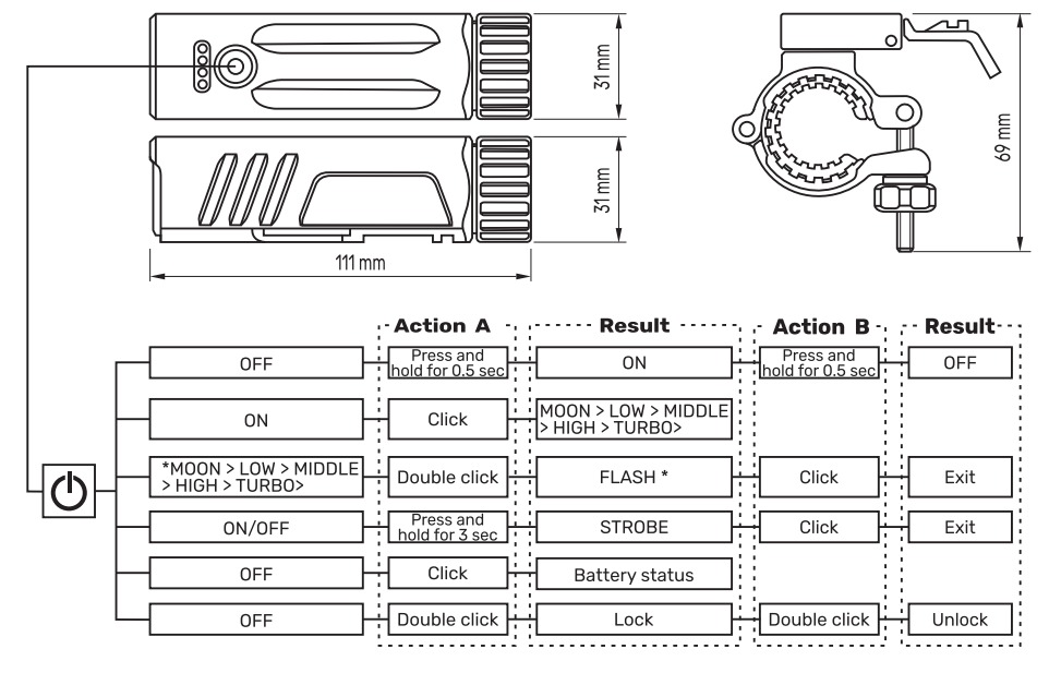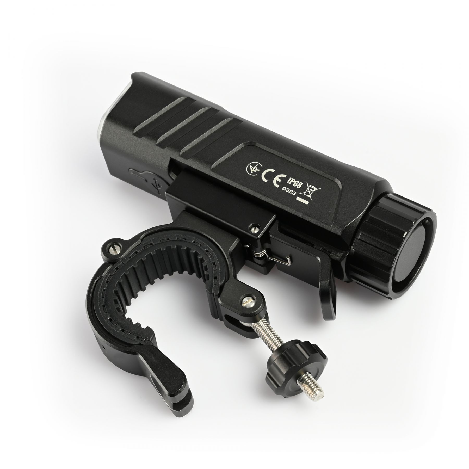 - Łatwa instalacja: mocowanie latarki do kierownicy roweru jest bardzo proste, szybkie i niezawodne. Całkowicie aluminiowy montaż z mechanizmem szybkiego zwalniania pozwala na montaż lub demontaż latarki w kilka sekund.