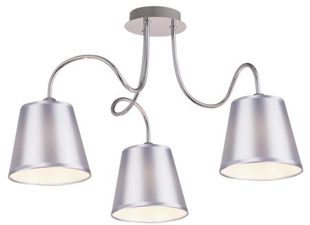 Elegancka w swej prostocie oprawa sufitowa, stożkowe abażury z tkaniny - od strony wewnętrznej usztywniane przez PCW. Szaro srebrna kolorystyka abażurów w połączeniu z błyszczącym chromem podkreśla elegancję, dedykowana do nowoczesnych wnętrz.