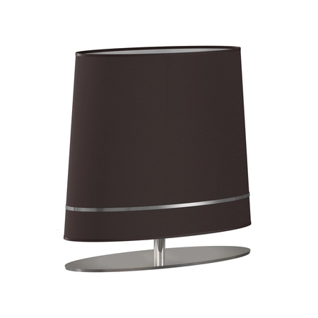 Elegancka lampa stojąca na owalnej podstawie. Ma jedno źródło światła oraz abażur.