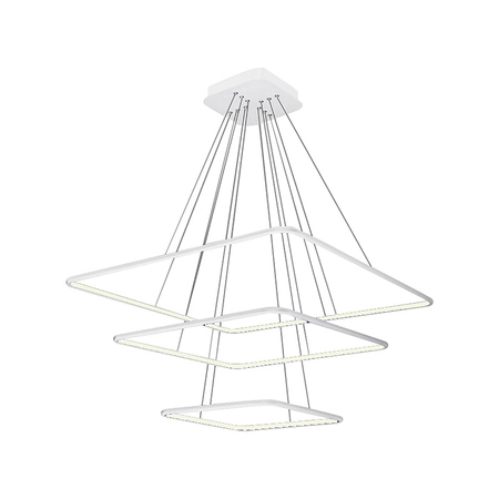 NIX WHITE 515 to wisząca lampa sufitowa od marki MiLAGRO. Składa się z trzech opraw, w kształcie kwadratów ułożonych poziomo. W oprawach o zróżnicowanej wielkości umieszczono trzy źródła światła w formie modułu LED. Szerokość lampy w najszerszym miejscu wynosi 80 cm, a szerokość najmniejszej obudowy sięga 40 cm. Obudowy znajdują się na czterech regulowanych zawiesiach każda. Z drugiej strony przyczepiono je do kwadratowej podsufitki. Wymienne moduły LED świecą ciepłą, białą barwą o temperaturze 3000 K. Strumień świetlny tego urządzenia to 8190 lm. Energooszczędny LED ma moc 117 W, co odpowiada mocy 585 W w przypadku tradycyjnej żarówki.