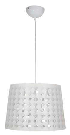 Abażur z laserowo wyciętym wzorem w kształcie kratki dodający lekkości; oprawa wspaniale będzie prezentować się w większych przestrzeniach salonów, sypialni, biur, sklepów czy restauracji. Idealna jako samodzielne oświetlenie, jak i w większej grupie, tworząc niezwykłą kompozycję. Łatwy w czyszczeniu abażur; zawieszona na zawiesiu z metalową podsufitką