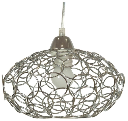 industrialna oprawa z metalowym przestrzennym kloszem wykonanym z drutu; chromowne wykończenie dodaje elegencji; zawiesie z transparentnym przewodem i dekoracyjną metalową nadkloszówką zapenia regulację wysokości poprzez skrócenie i zapewni optymalne dopasowanie do oświetlanych wnętrz